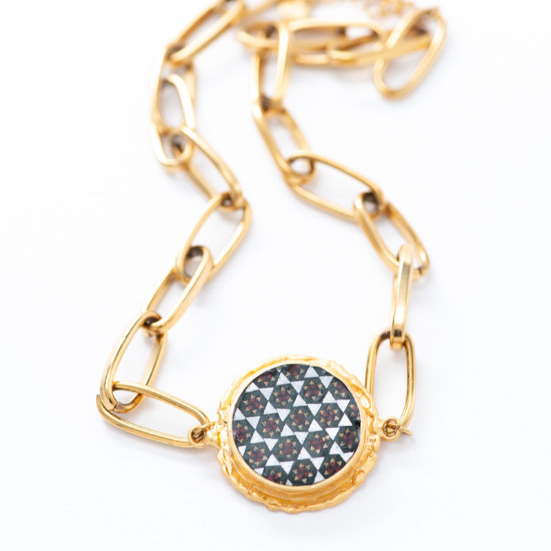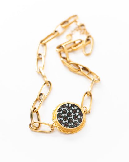 This necklace is an exquisite blend of delicate Isfahan Khatam and 18K gold plated base. The chain is gold plated paperclip and centre piece has hexagon pattern khatam. This necklace adds a touch of elegance to any outfit.