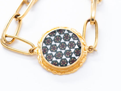 Gold plated brass, Khatam (wood, brass, bone), Gold plated paper clip chain