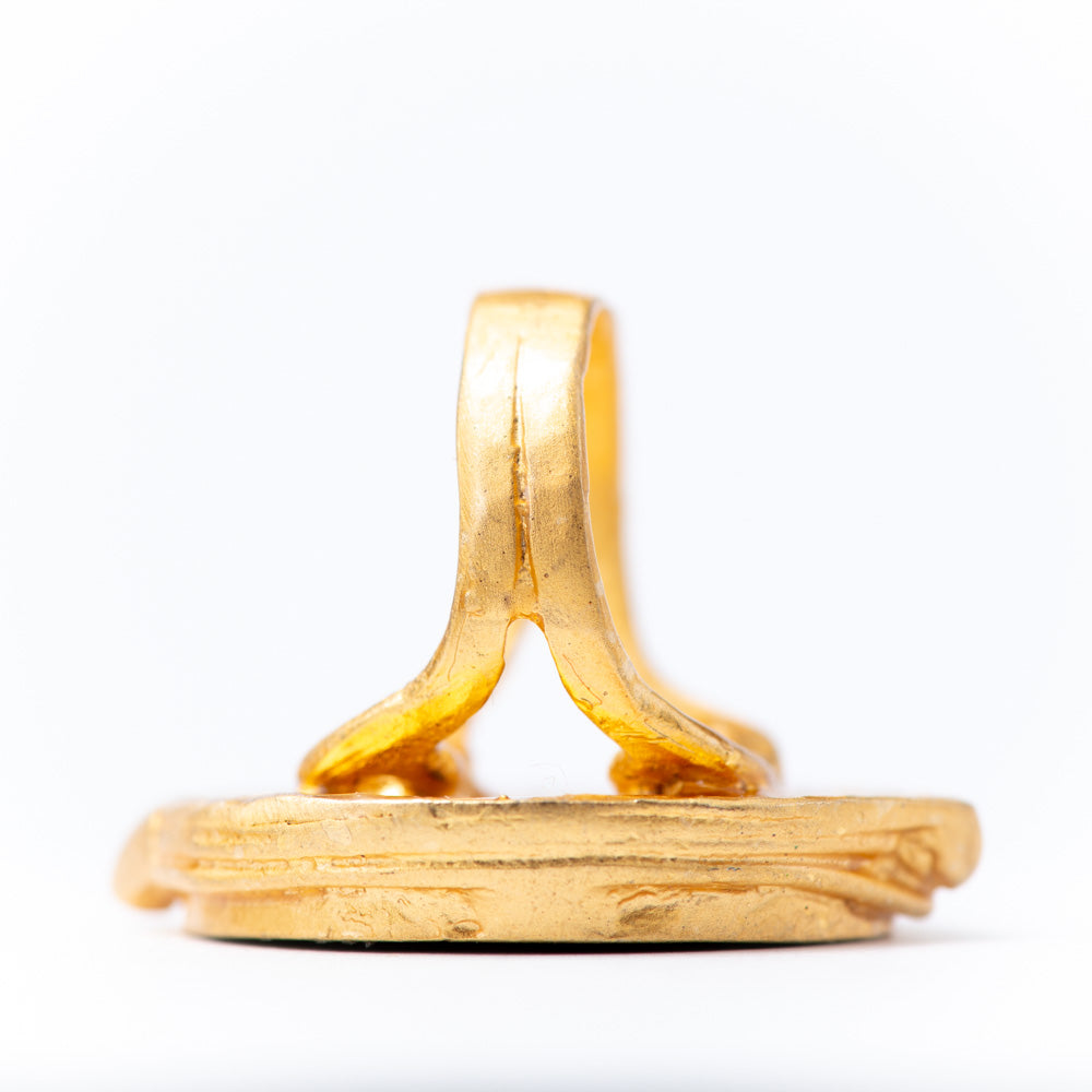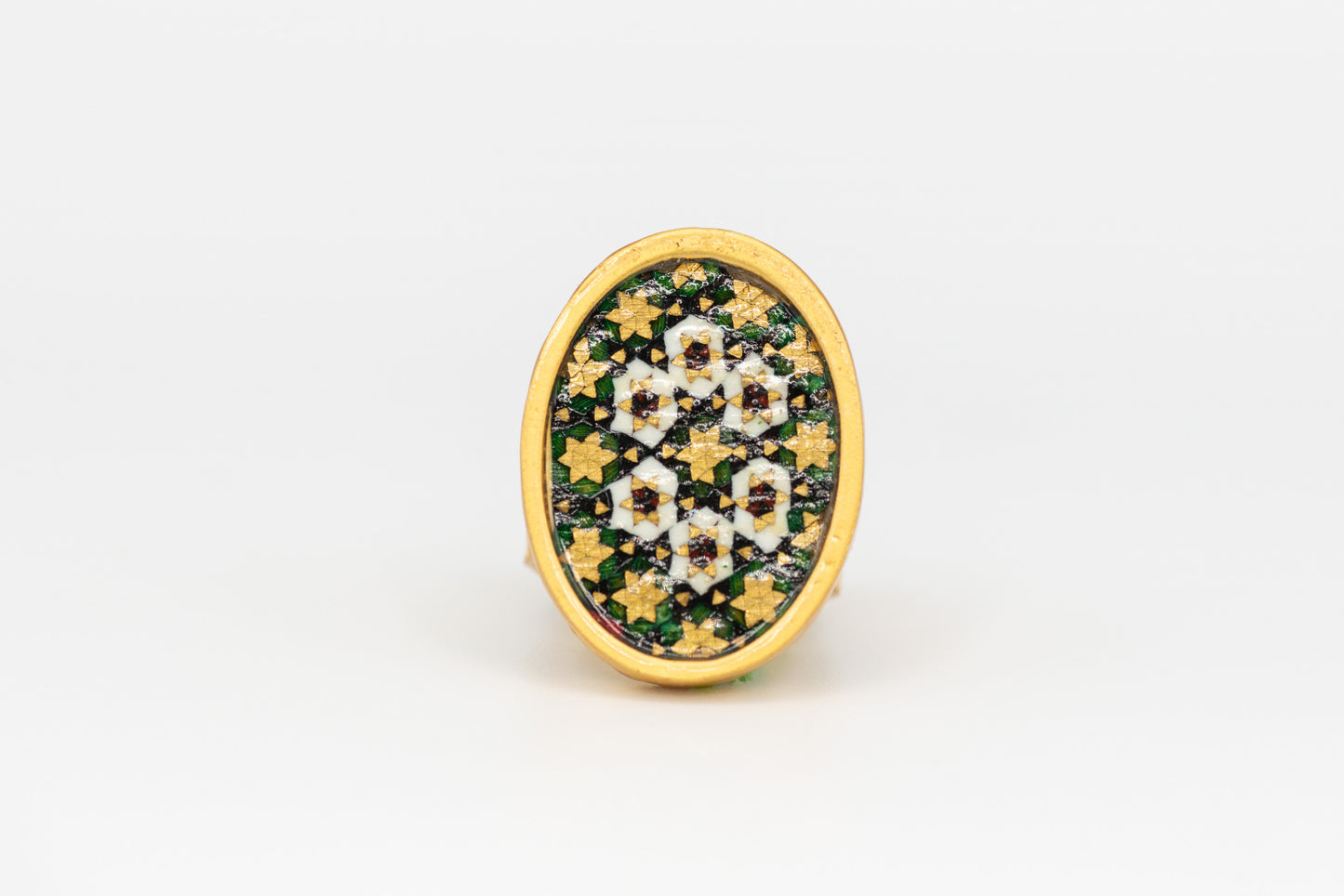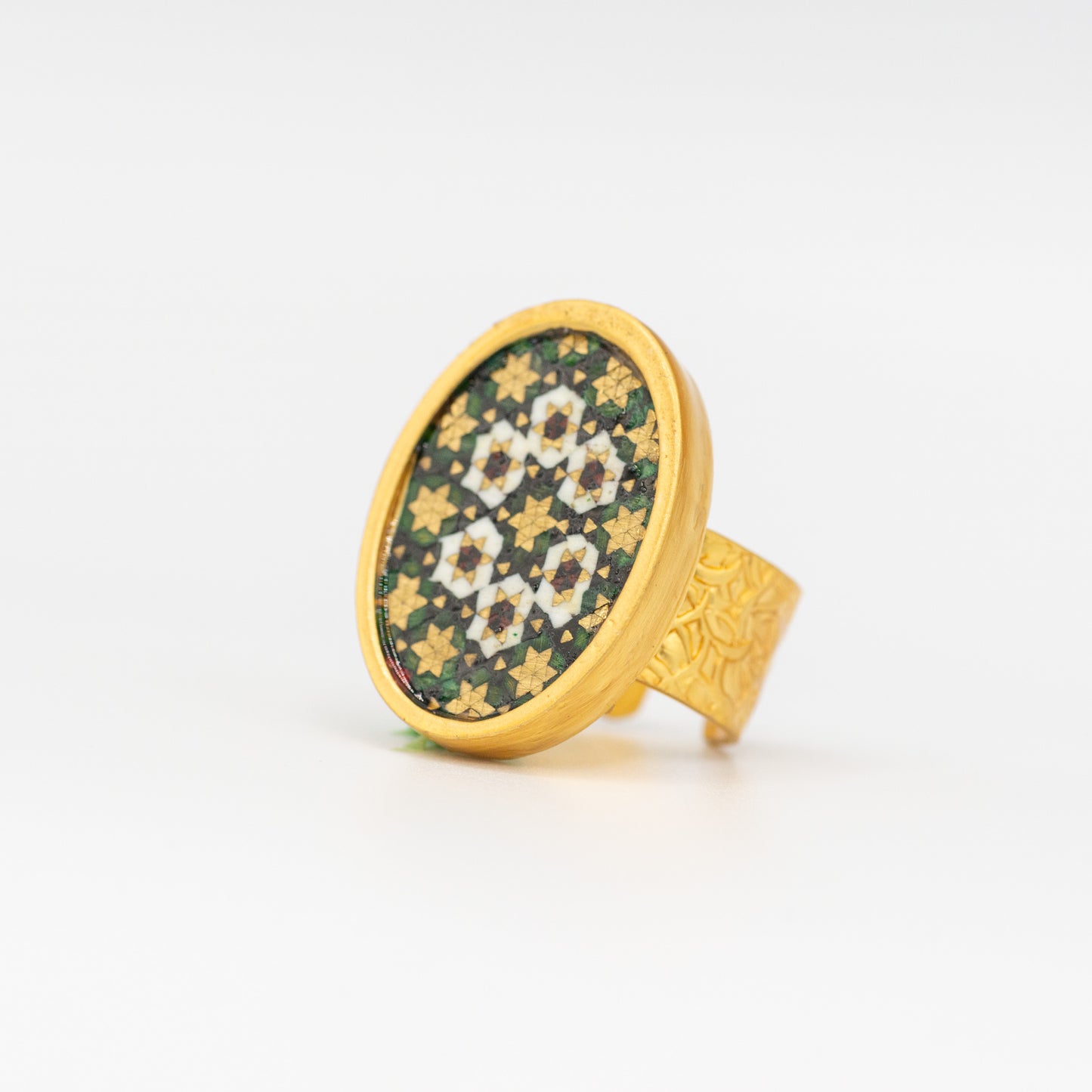 This square ring is an exquisite blend of delicate Isfahan Khatam and 18K gold plated base. The gold, green and white pattern of this unique ring is a testament of skilled craftsmanship and adds a touch of elegance to any outfit.