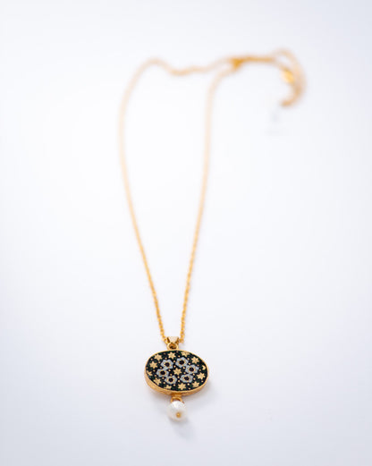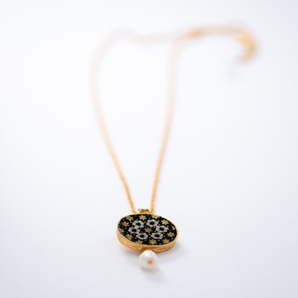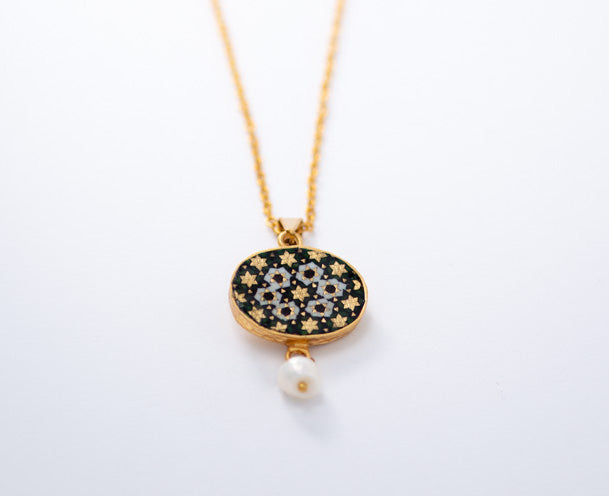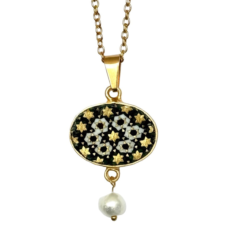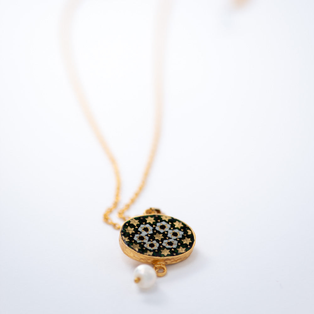 This necklace captures the radiant beauty of a traditional pattern, with intricate Khatam inlay set in glowing 22K gold plated base. This handcrafted piece illuminates your neckline with the warmth and brilliance of the East, a symbol of elegance and heritage.
