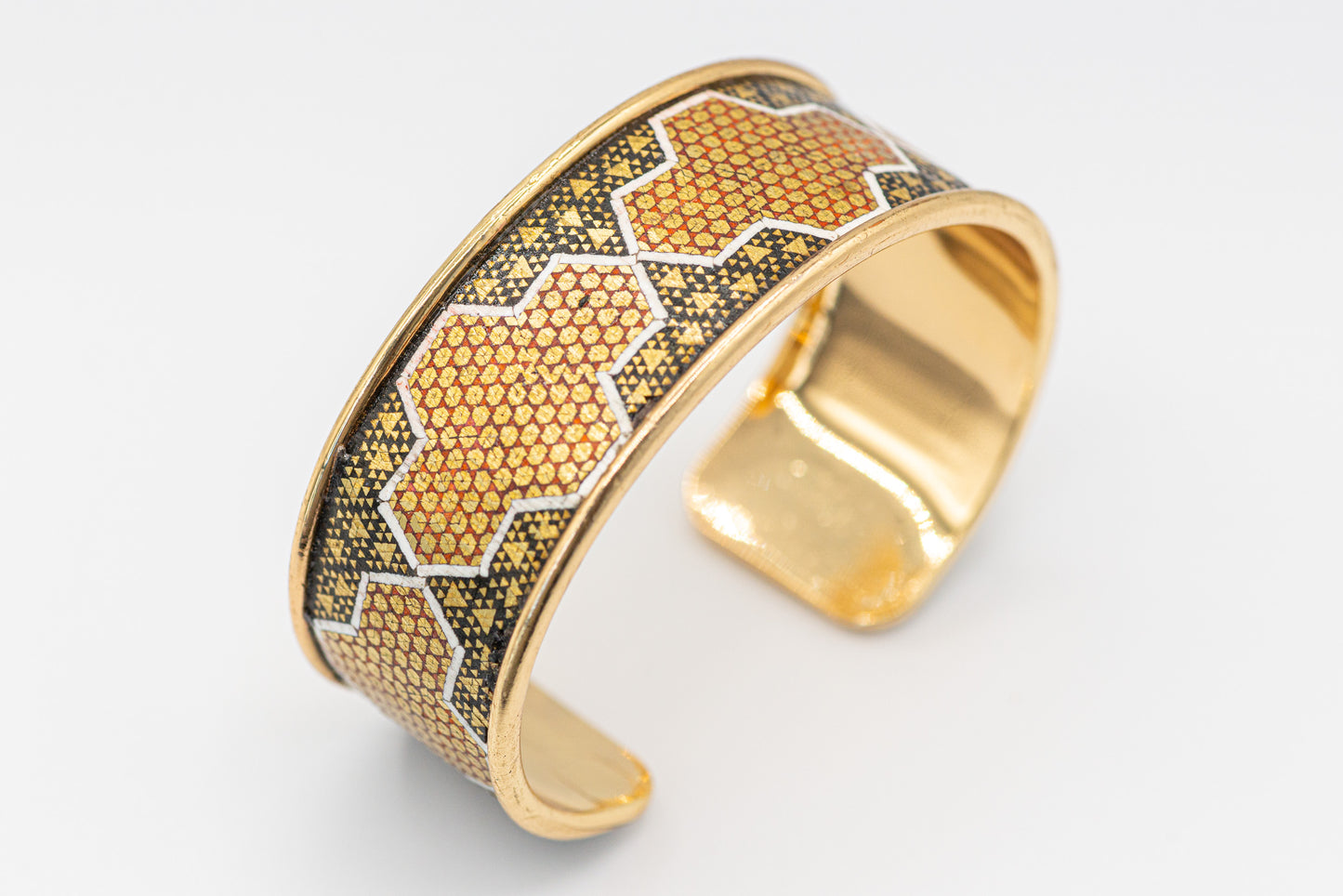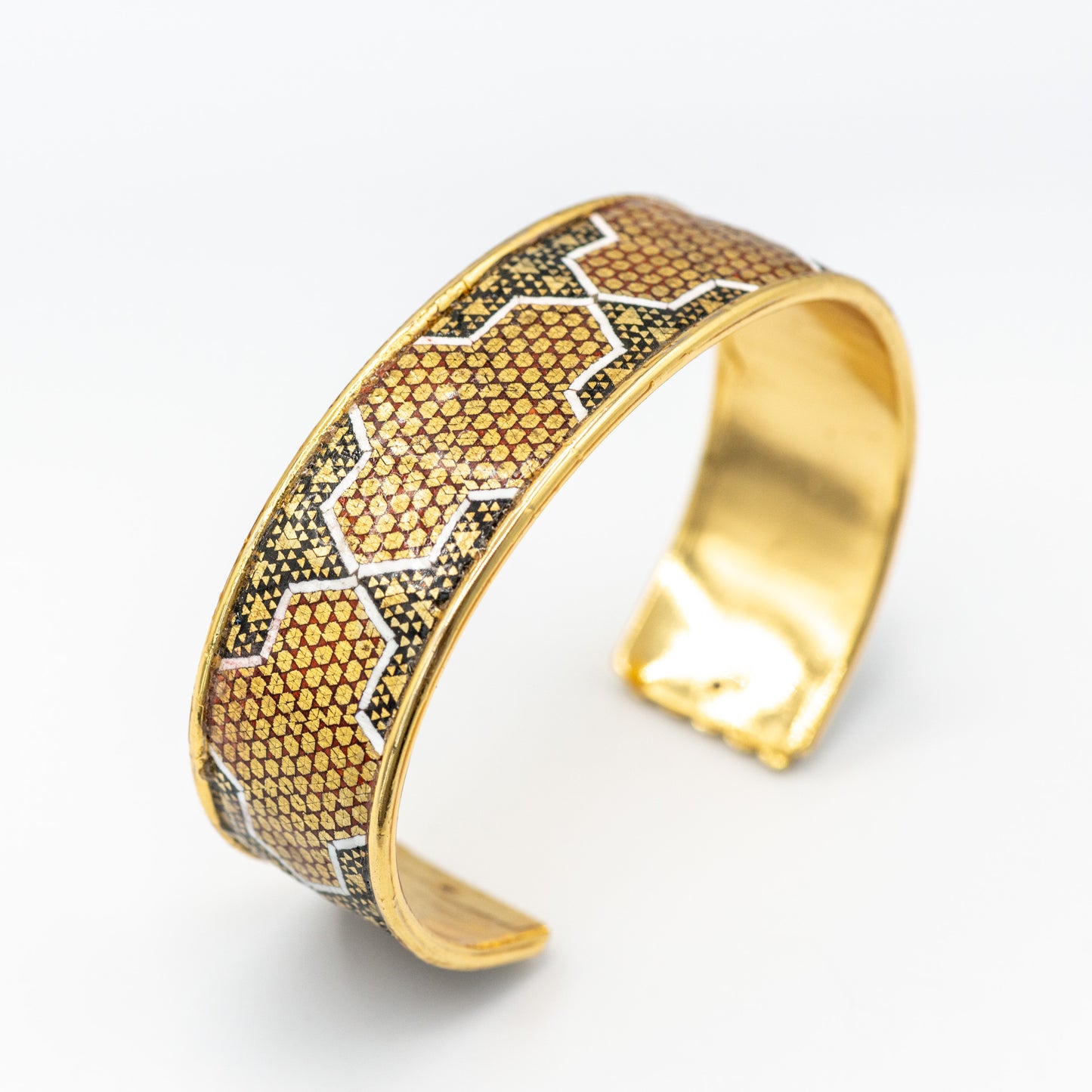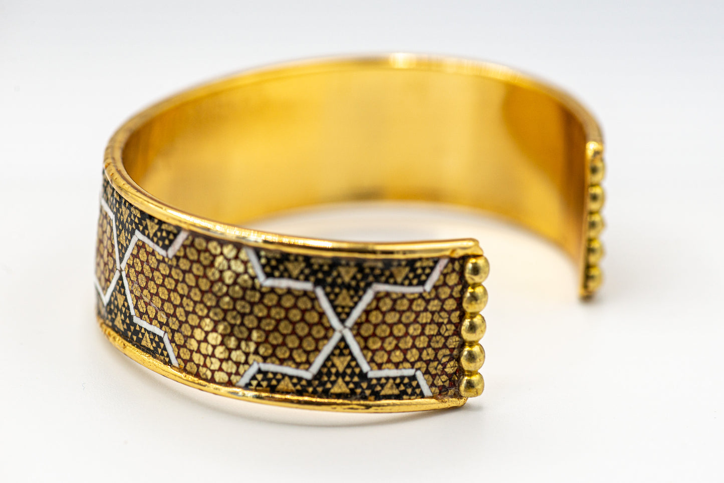 Inspired by the ancient Persian patterns of Isfahan this bracelet cuff is an exquisite blend of delicate Isfahan Khatam and gold plated base. This brace comes in two widths, the 2cm one is gold plated and the 2.5cm one is polished brass.