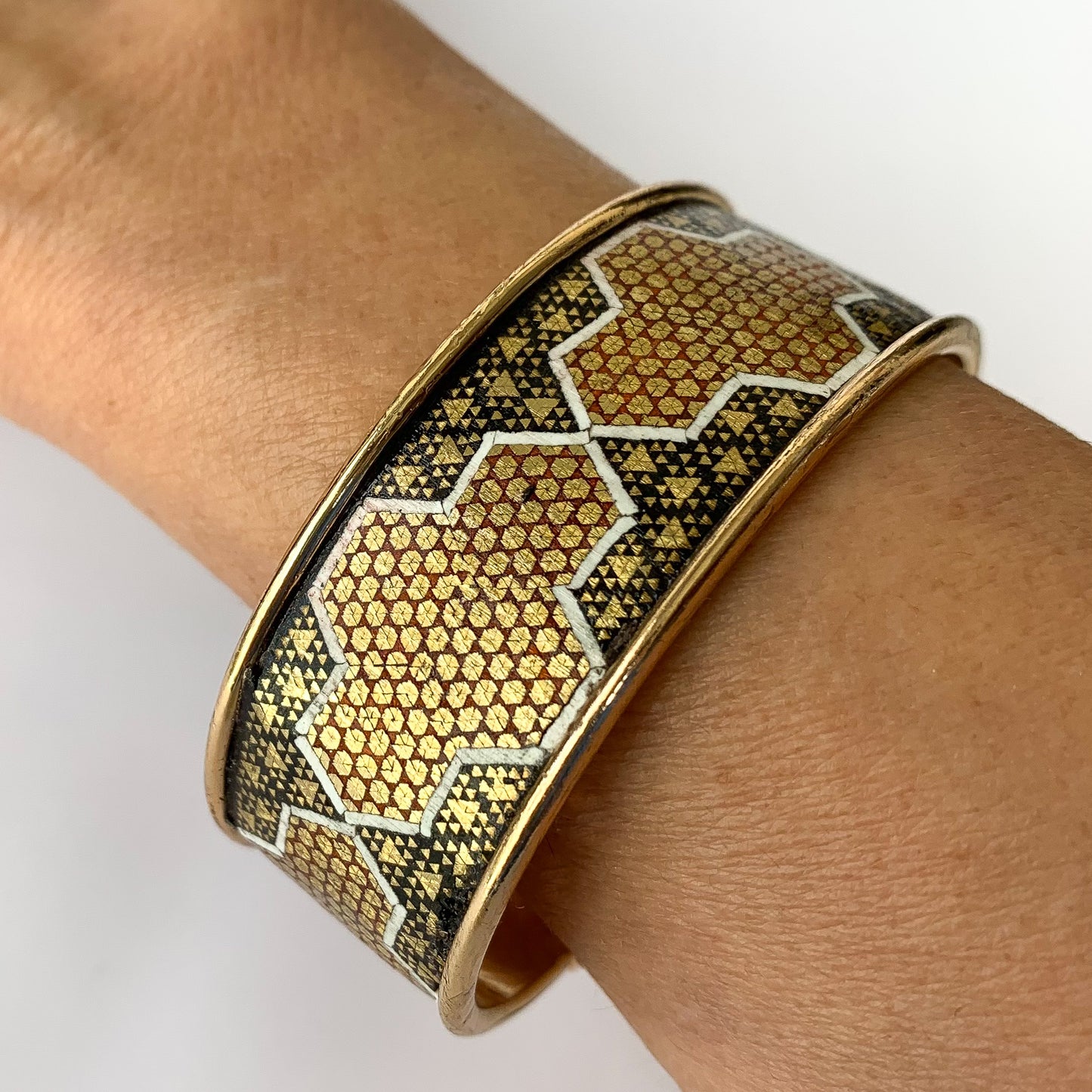 This bracelet cuff showcases the intricate Persian art of inlaying known as "Khatam," which involves meticulously arranging delicate fragments of colored woods, ivory, bone, brass, silver, and other metals into precisely-cut geometric patterns. A single work of average quality can contain over 400 pieces per square inch, highlighting the meticulous craftsmanship involved in its creation.