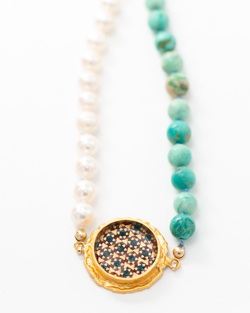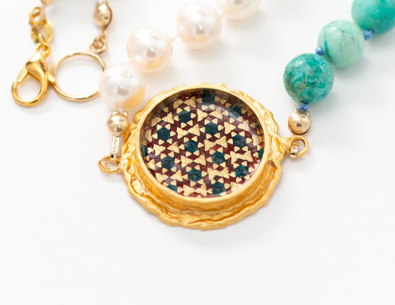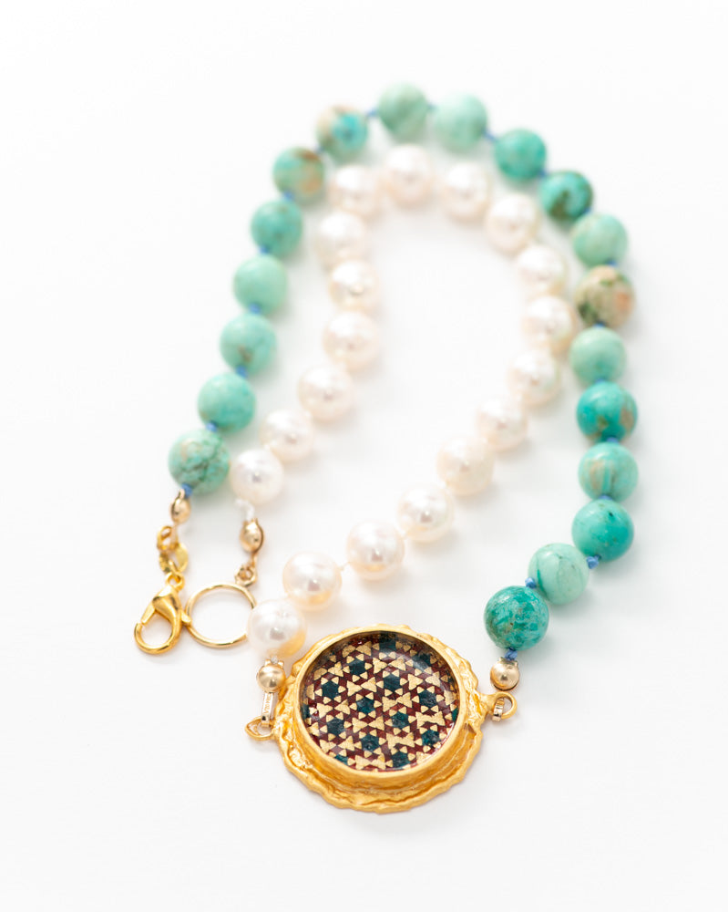 AAA Freshwater pearl, AAA Peruvian turquoise, Handmade Isfahan Khatam (wood, brass, bone)