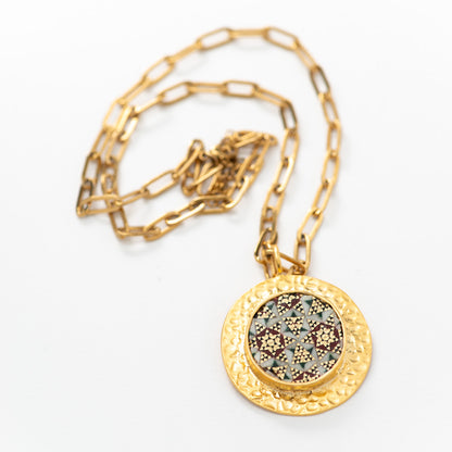 The "Golshan | Round" necklace captures the radiant beauty of a traditional pattern, with intricate Khatam inlay set in glowing 22K gold plated base. This handcrafted piece illuminates your neckline with the warmth and brilliance of the East, a symbol of elegance and heritage.