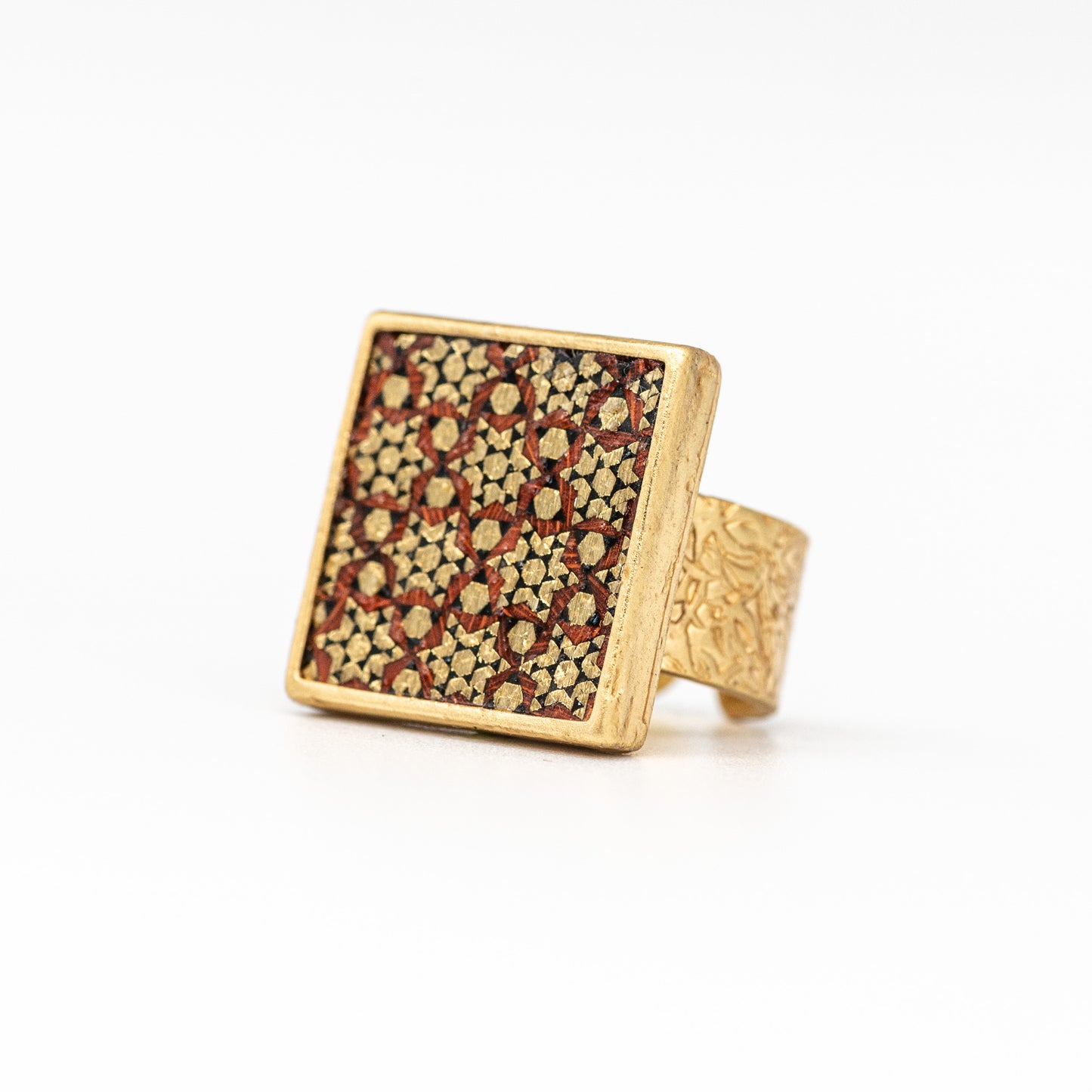 This square ring is an exquisite blend of delicate Isfahan Khatam and 18K gold plated base. The gold, red and black tambourine pattern of this unique ring is a testament of skilled craftsmanship and adds a touch of elegance to any outfit.