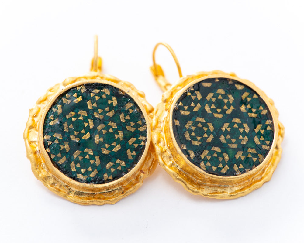 This earring showcases the intricate Persian art of inlaying known as "Khatam," which involves meticulously arranging delicate fragments of coloured woods, ivory, bone, brass, silver, and other metals into precisely-cut geometric patterns. A single work of average quality can contain over 400 pieces per square inch, highlighting the meticulous craftsmanship involved in its creation.